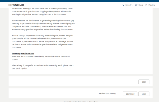 From the “Download” section of the questionnaire, you can download draft documents (at any stage).