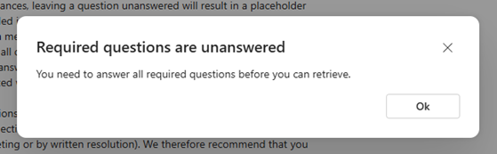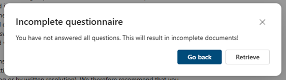 A warning will appear if any information which is required for the generation of documents has not been provided [screenshot 1], or if the questionnaire is otherwise incomplete [screenshot 2].