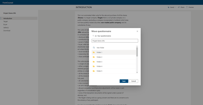 On opening, every new questionnaire will automatically be saved into your ‘My Questionnaires’ folder on the FC Documents portal. From here it can be renamed and moved into your own folder structure as required. Questionnaires autosave whenever a change is made within them.